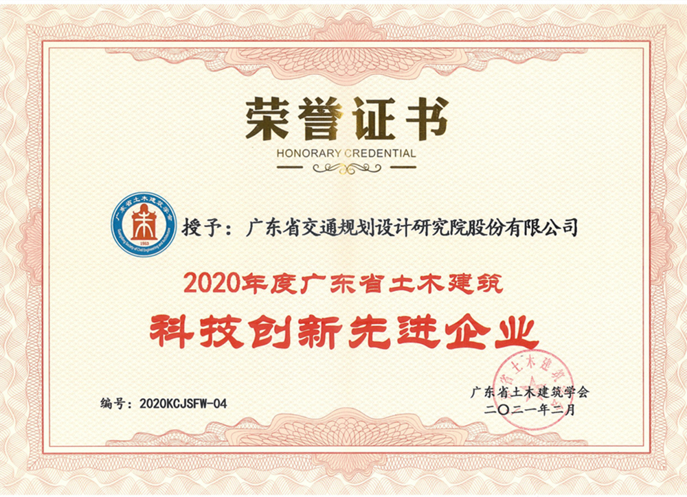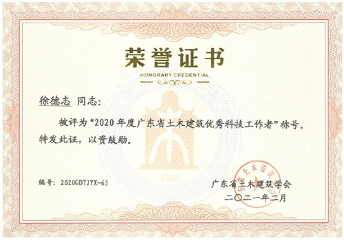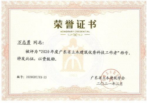 近日,公司被广东省土木建筑学会授予“2020年度广东省土木建筑科技创新先进企业”荣誉称号;公司副总工程师梁志勇和万志勇、岩土勘察院院长张金平、第四设计院总工程师徐德志4人被评为“2020年度广东省土木建筑优秀科技工作者”。特此报喜。