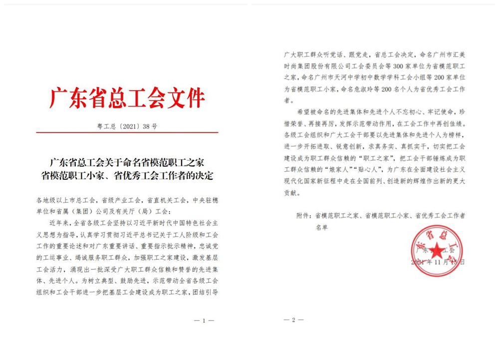近日,从广东省总工会传来喜讯,我公司荣获“广东省模范职工之家”称号。这是集团公司首次获得该项荣誉,是对集团公司工会围绕中心,服务大局,切实做好职工“娘家人”、“贴心人”的肯定,特此报喜!