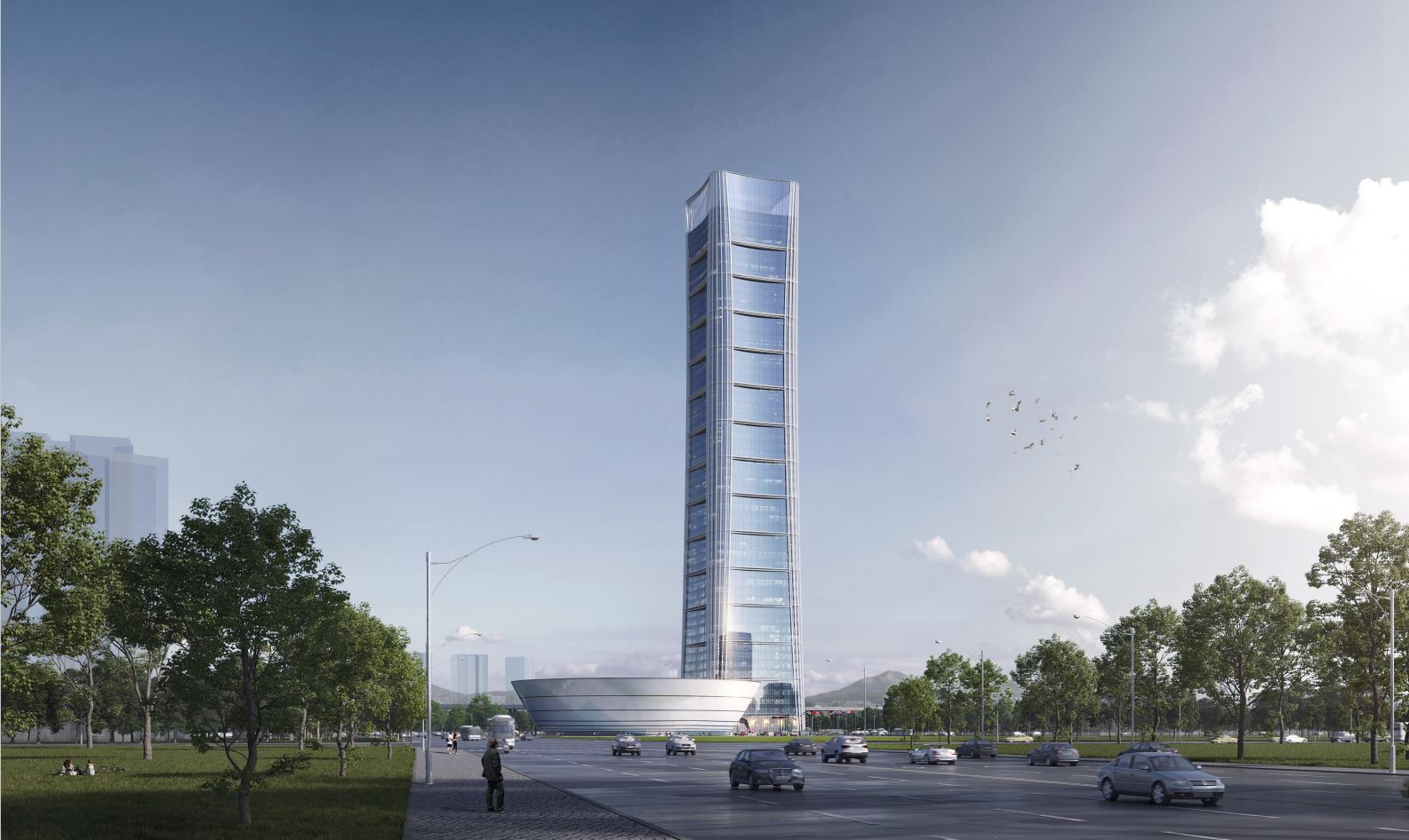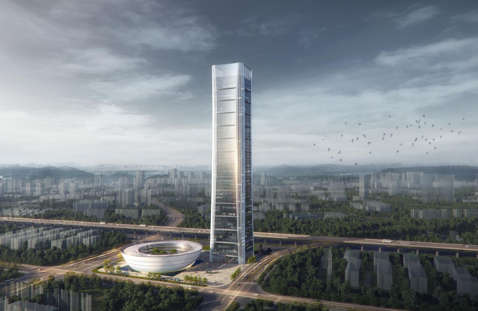 湾区之源方案以天下万物生于有,有生于无为设计主题,由塔楼和裙楼两部分组成,长短相形,高下相倾,前后相随。塔楼功能以办公和商住为主,外立面造型灵感来自竹节,象征“生生不息,坚韧不拔”;裙楼平面布置可塑性强,可满足会议、会展、商演等多功能需求,形似容器,通体浑圆,寓意“包容并蓄,有容乃大”。同时,方案围绕“绿色、环保”进行了多项创新设计。