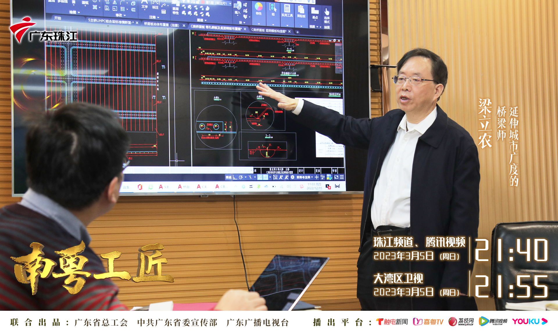伟德国际victor1946首席专家、全国十大桥梁人物、广东省工程勘察设计大师、中国公路学会优秀科技工作者、全国公路优秀勘察设计师、广东省五一劳动奖章、“南粤工匠”梁立农的个人专题纪录片《南粤工匠——延伸城市广度的桥梁师》于2023年3月6日在珠江频道、大湾区卫视以及腾讯视频、优酷、喜粤TV、广州地铁电视等新媒体平台与观众见面。