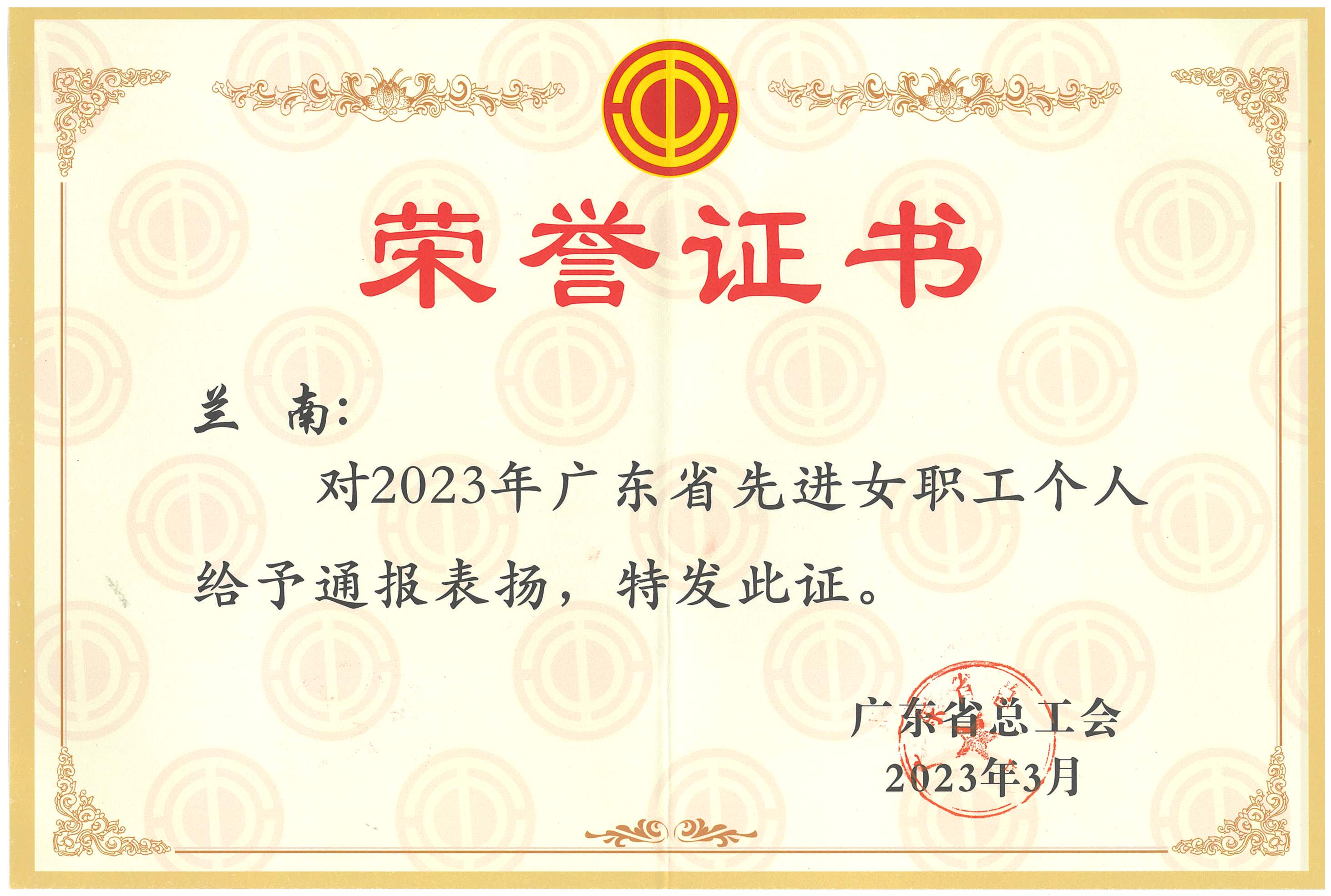 近日,从广东省总工会传来喜讯,集团九域公司总工程师兰南同志被授予“2023年广东省先进女职工个人”荣誉称号,特此报喜。