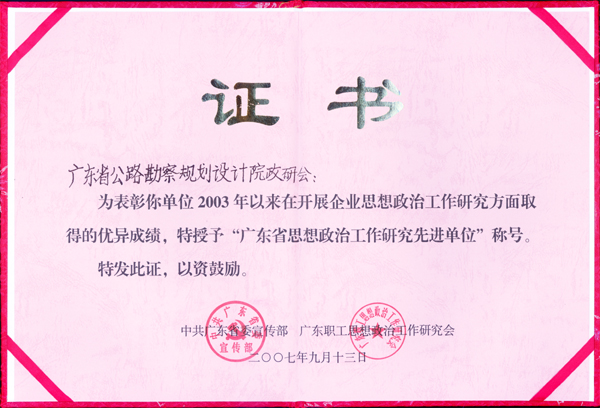 省委宣传部、省政研会《关于表彰广东省思想政治工作研究先进单位和先进工作者的通报》获悉,我院荣获先进单位称号,刷新思想政治工作研究荣获省级奖励的纪录。这是对我院2006年“职工思想政治教育年”活动的充分肯定,同时也是近年来我院在体制转型时期深入实践科学发展观,加强员工思想政治教育工作,努力探索企业文化建设,构建和谐企业,促进企业健康发展方面所取得的优秀成果。我们坚信,这将成为我院思想政治工作研究的新动力,必将促进我院企业文化建设的新发展。