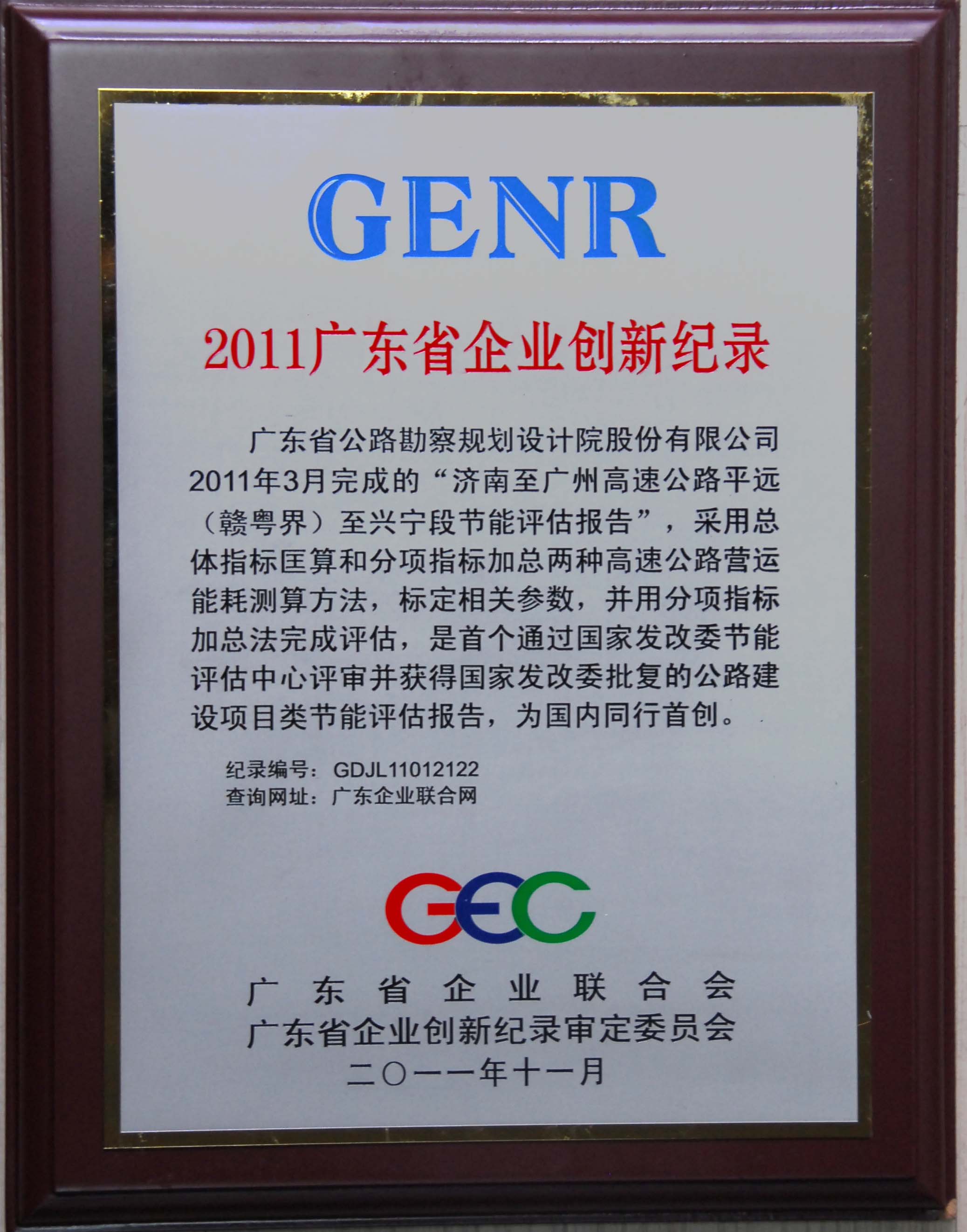 日前,公司编制的“济南至广州高速公路平远(赣粤界)至兴宁段节能评估报告”顺利通过广东省企业创新纪录组委会和广东省企业创新纪录审定委员会审核,入选2011年广东省企业创新纪录(纪录号GDJL11012122)。本次评选活动由广东省企业联合会和广东省企业家协会联合主办。