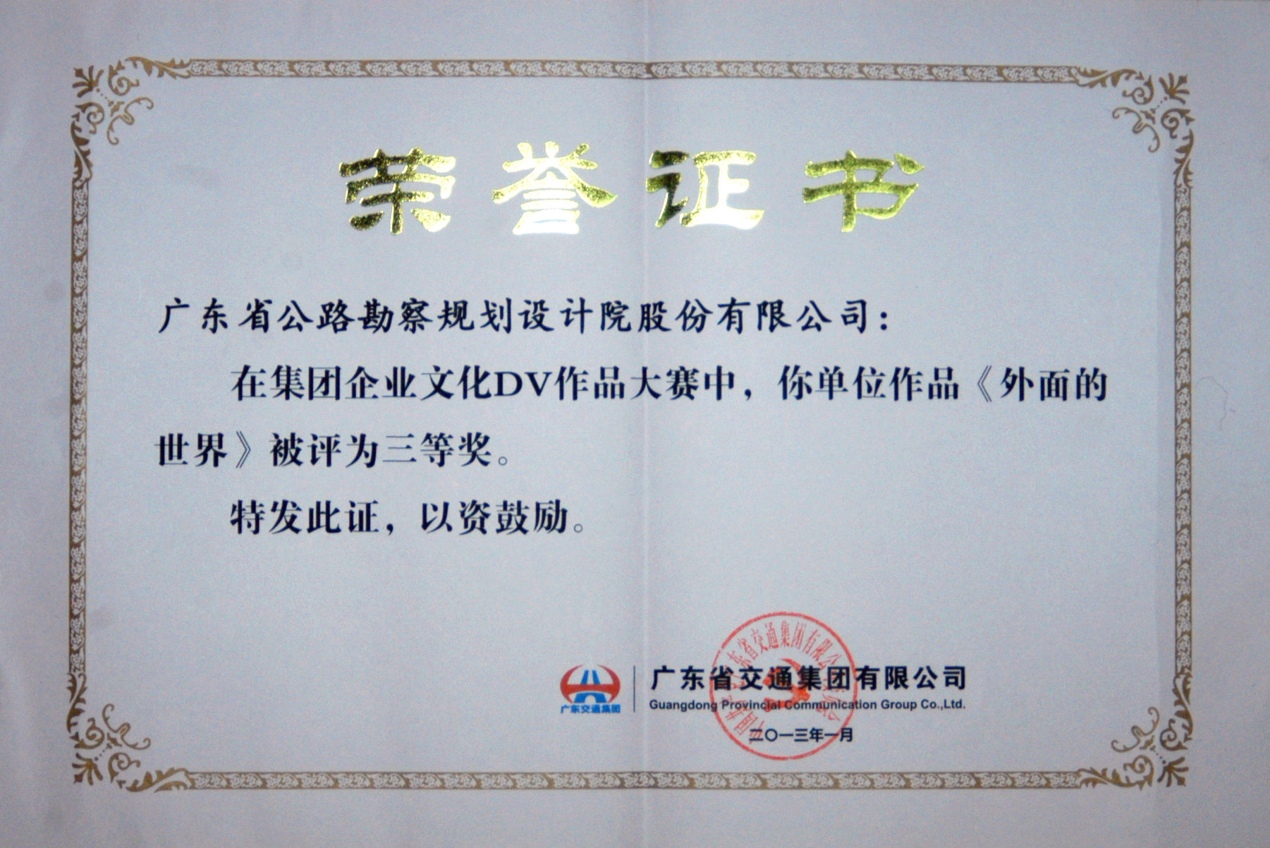 省交通集团企业文化DV作品大赛获奖名单近日揭晓,我司共推荐了7件DV作品参选,其中,由行政事务部张安静编辑制作的《外面的世界》在众多优秀作品中脱颖而出,荣获本次比赛三等奖。
