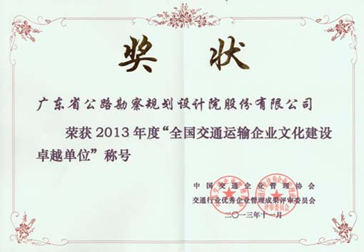 在近日召开的第八届全国交通运输企业文化建设高峰会上,我司荣获2013年度“全国交通运输企业文化建设卓越单位”称号。至此,公司已连续三年被评为全国交通运输企业文化建设卓越单位。特此报喜。