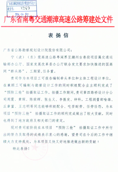 潮漳高速设计服务工作受业主表扬