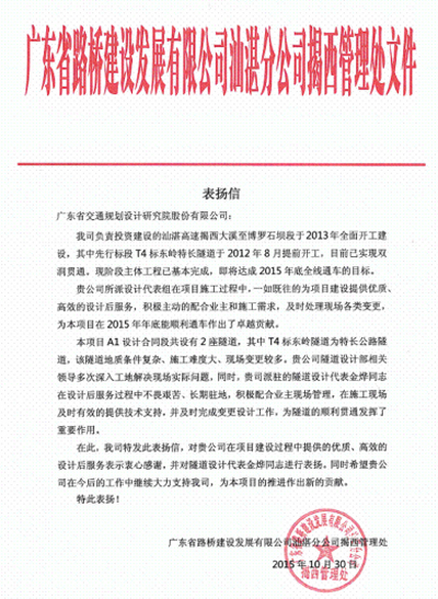 近日,广东省路桥建设发展有限公司汕湛分公司揭西管理处发来表扬信,对我司在汕湛高速揭西大溪至博罗石坝段中提供的专业、高效、优质服务表示赞扬,同时对负责该项目的隧道设计部派驻的隧道设计代表金烨同志给予了通报表扬。目前该项目已基本完成主体工程,即将达成2015年底全线通车的目标。