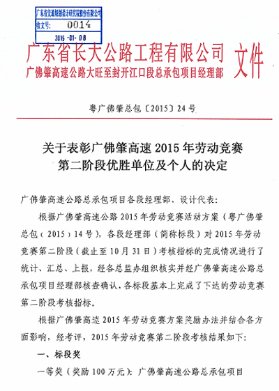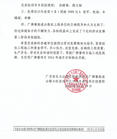 近日,我司第五路桥设计分公司驻广佛肇高速公路大旺至封开江口段设计代表牟键超同志受到广东省长大公路工程有限公司广佛肇高速公路大旺至封开江口段总承包项目经理部表彰,荣获广佛肇高速2015年劳动竞赛第二阶段 “优秀设计代表”称号。特此报喜。