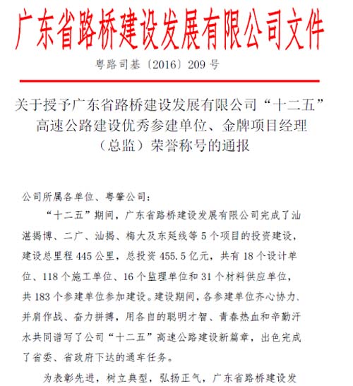 近日,广东省路桥建设发展有限公司召开了“省路桥公司‘十二五’期间建设成就表彰大会”,我公司因第三分公司负责设计的揭博高速公路和二广高速公路表现突出,被授予“广东省路桥建设发展有限公司‘十二五’高速公路建设优秀参建单位”荣誉称号。 特此报喜。