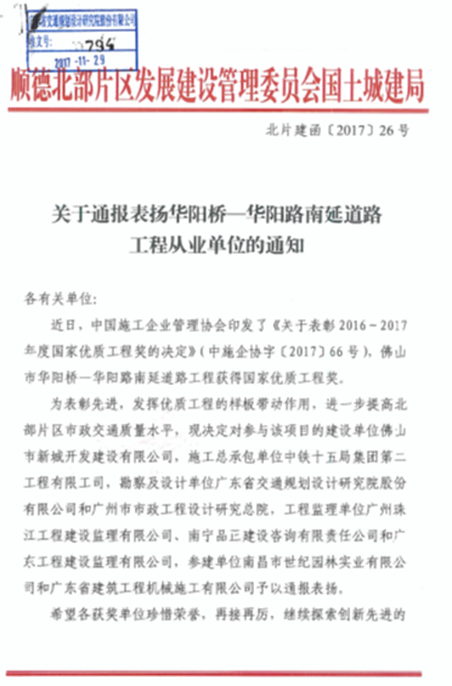 佛山市华阳桥—华阳路南延道路工程获得了中国施工企业管理协会授予的“2016-2017年度国家优质工程奖”。