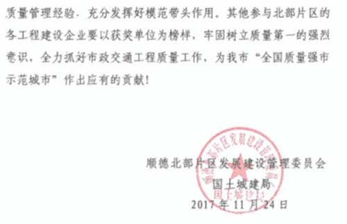 近日,公司受顺德北部片区发展建设管理委员会国土城建局通报表扬,对我司在华阳桥—华阳路南延道路工程中提供的勘察设计服务质量表示充分肯定和赞扬,负责该项目的市政设计分公司表现突出,进一步树立了公司良好品牌形象,特此报喜!