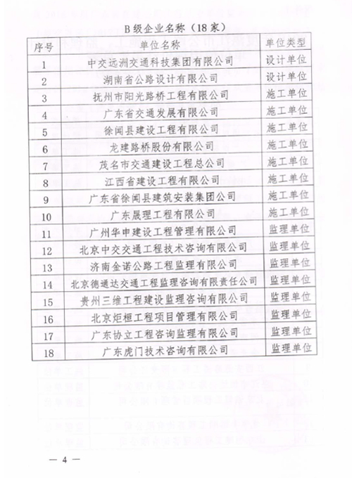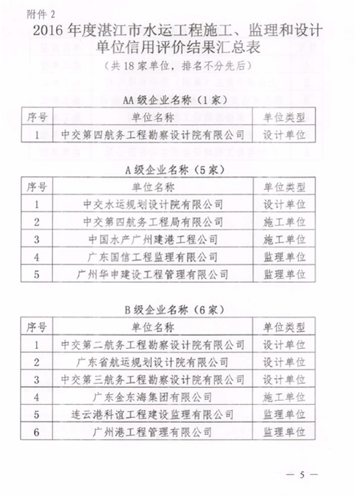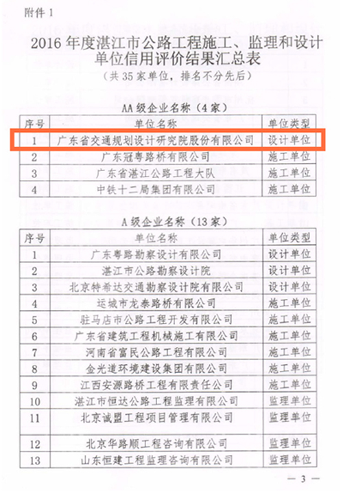 近日,湛江市交通运输局公布了2016年度湛江市公路水运工程从业单位信用评价结果。我公司荣获2016年度湛江市公路工程施工、监理和设计单位信用评价AA级企业。 信用评价是企业履行质量承诺能力的证明,是企业对外经营的有效“通行证”。此次评价进一步反映了我公司的设计质量得到了市场认可。