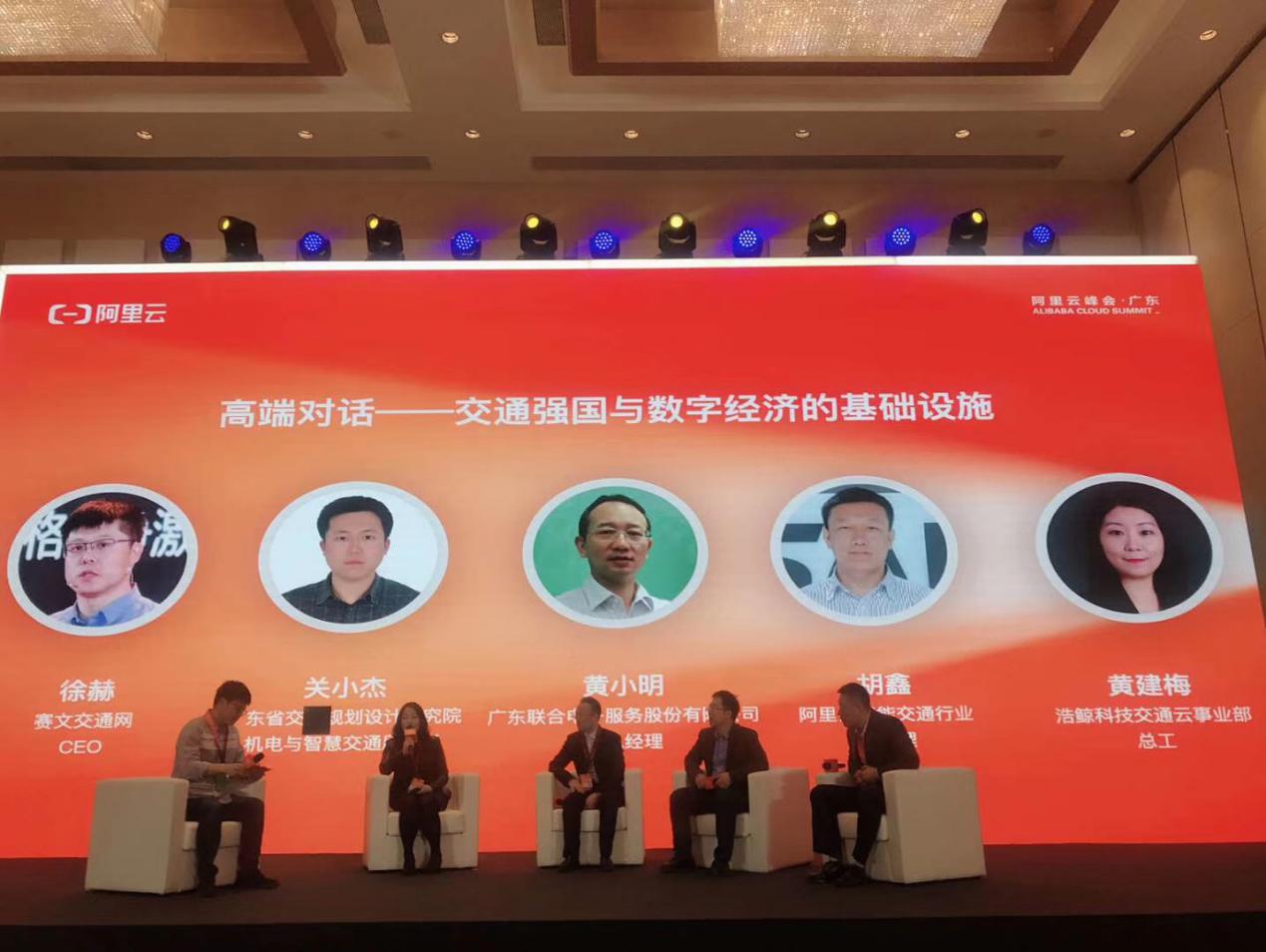 在智慧交通专场的最后环节,关小杰代表我公司与广东联合电子服务股份有限公司副总经理黄小明、阿里云智能交通行业总经理胡鑫、赛文交通网CEO徐赫以及浩鲸科技交通云事业部总工黄建梅,一同围绕交通强国与数字交通展开圆桌对话,结合《交通强国建设纲要》具体内容,对今年取消省界站工作和自由流收费稽核进行总结,并针对智慧高速的未来发展进行了展望。